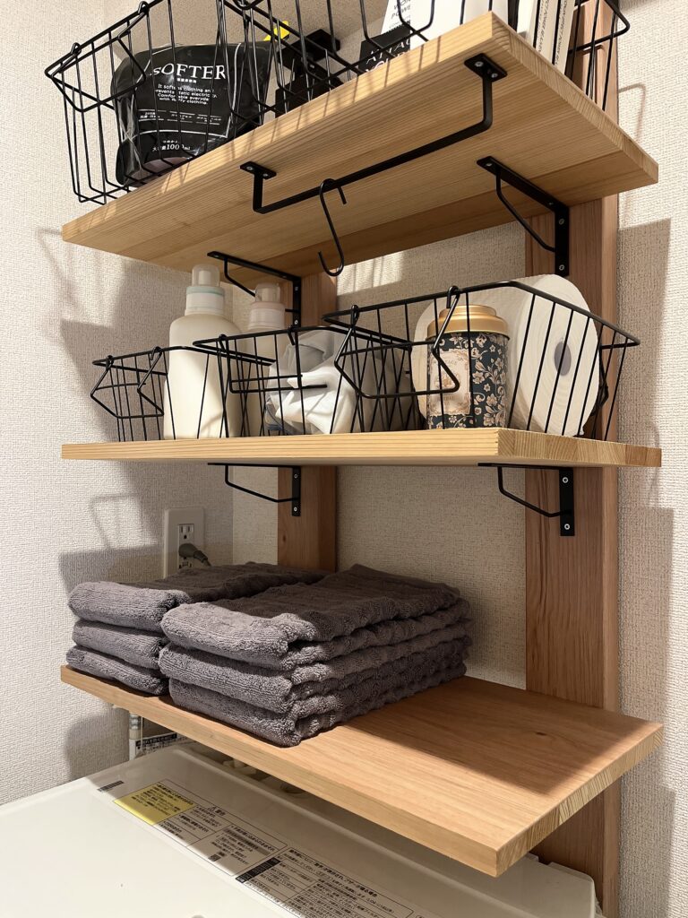 ちなみにこちらの洗濯機上収納棚は私がDIYしたお気に入りです。