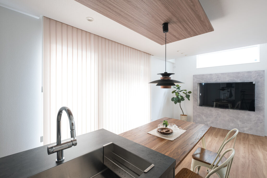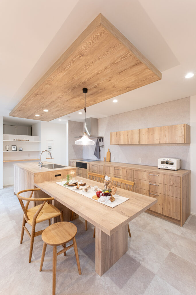 木目調の下がり天井で使用いたしました。グラフテクトのノッティナチュラルと似た木目を使用することで全体のバランスが良くなり、統一感を演出してくれます。飽きの来ないナチュラルテイストなデザインは、自然な温もりを感じさせ、長く愛され続ける空間に仕上げます。