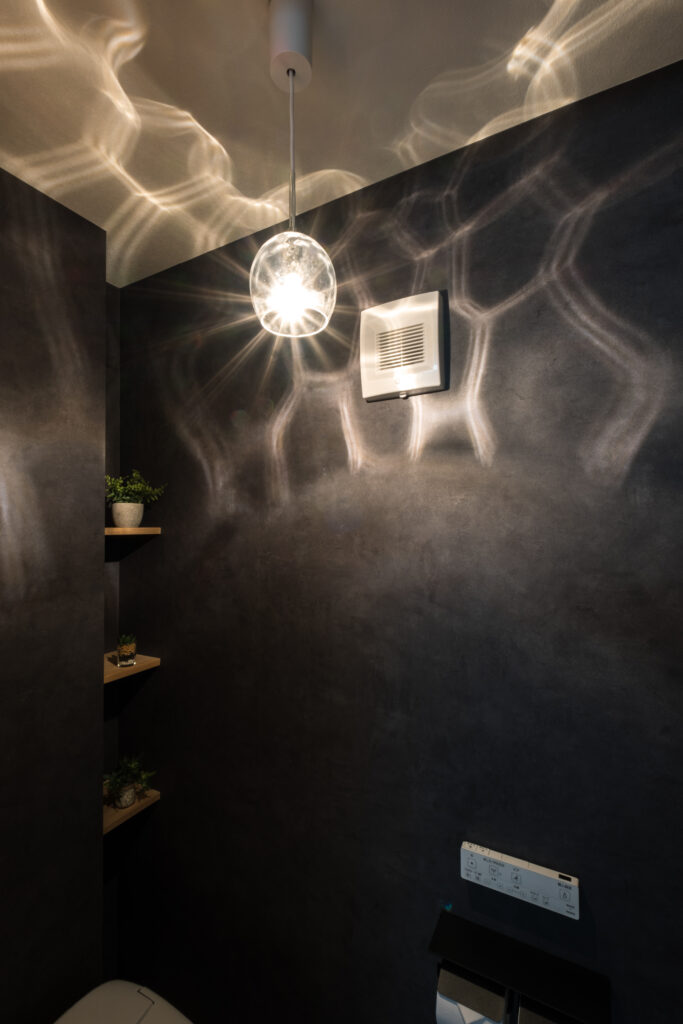 トイレの壁一面に使用いたしました。こちらもコンクリート調で黒一色ではないので、間接照明で照らすと色んな表情を見せてくれるクロスとなっています。奥行きのある格好良い印象を与えます。