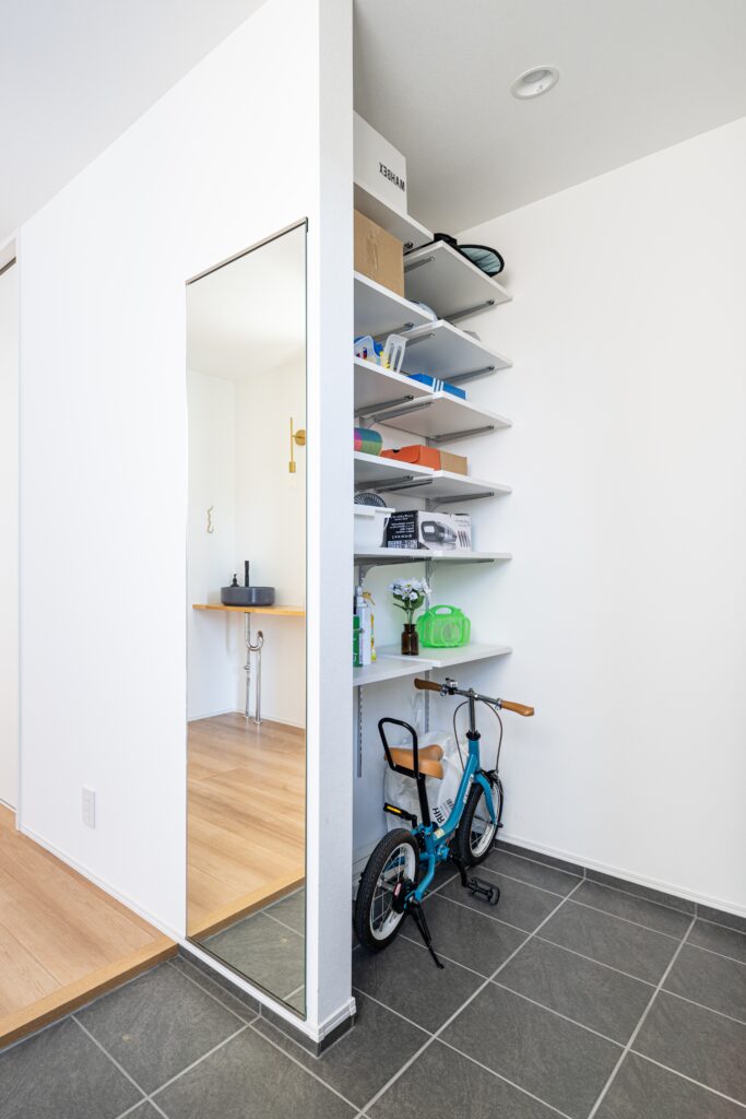 tsumuguでは、SIC(シューズインクローク)を玄関横につくり、靴以外に外遊びグッズやベビーカーなども収納できるようにしています。