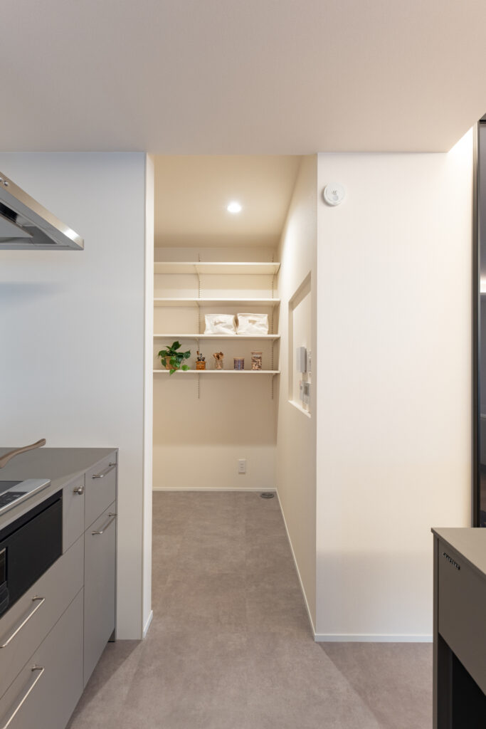 tsumuguでは、玄関〜キッチンまでを短く結ぶ“買い物動線”を意識して、玄関近くに食品庫を設けることもあります。