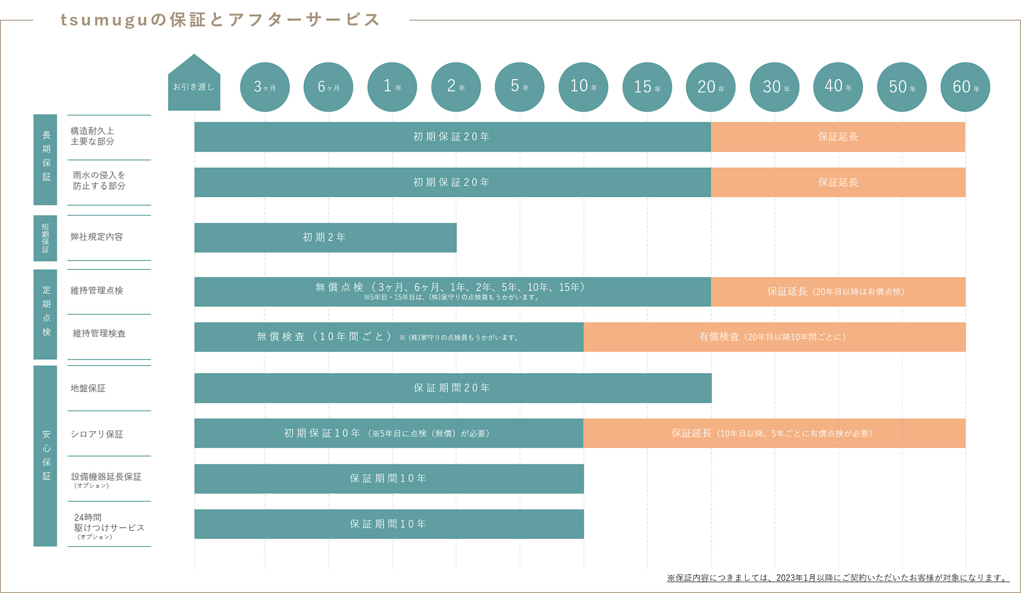 tsumuguでは、お客様が末永く安心してお住まいになっていただけるように、(株)家守りと提携することで、※初期保証20年、最長60年の保証を全棟お約束しております。