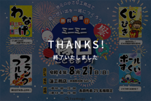 近所のちびっ子よっといで~!! ~tsumugu~㈱蓮工務店では2022年夏休みイベントとして 『ミニミニ縁日こどもまつり』を\無料開催/します。 ●わなげ●フランクフルト●くじびき●ボールすくい 4つのお店が無料で楽し … 続きを読む 『ミニミニ縁日こどもまつり』無料開催!