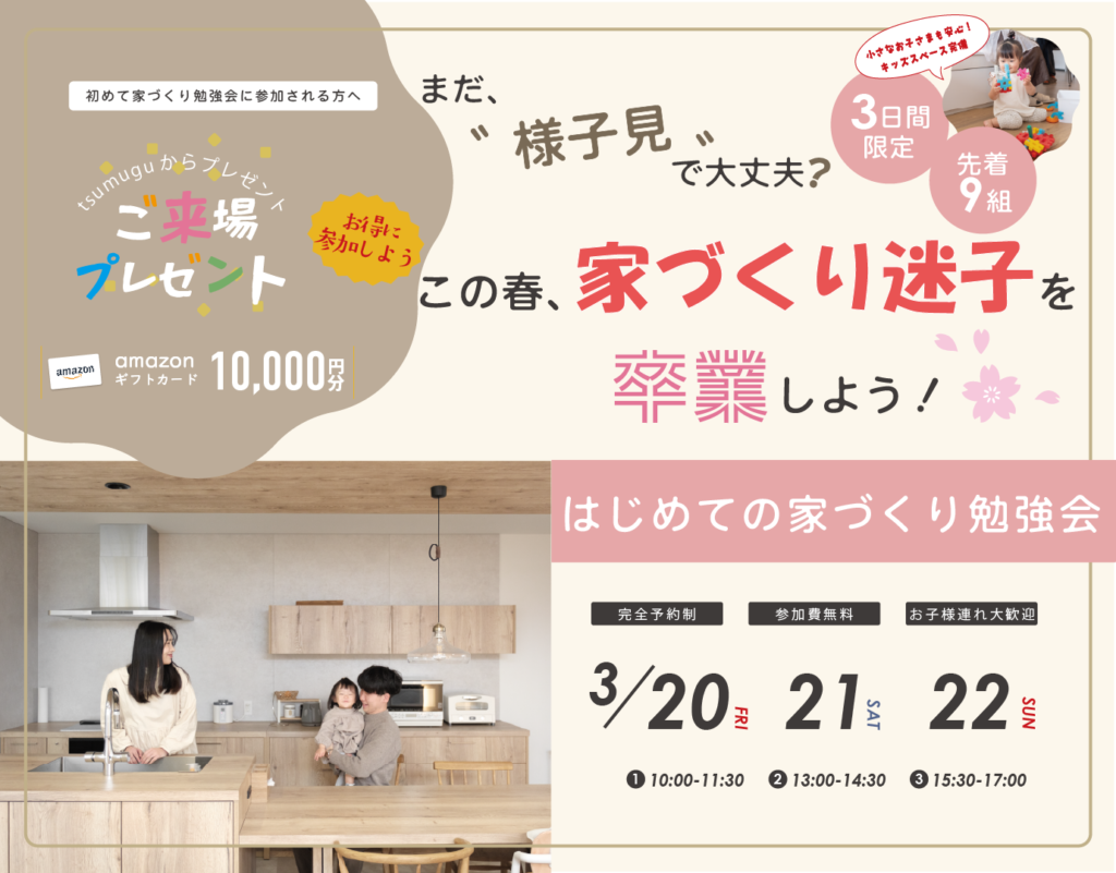 HOME お知らせ 3月イベント情報UPしました! 3月イベント情報UPしました! \\\ 3月イベント開催情報 ///■はじめての家づくり勉強会「家づくりって、何から始めればいいんだろう?」この春、家づくり迷子を卒業しよう!ぜひご参加くださいませ。 詳しくはコチラ